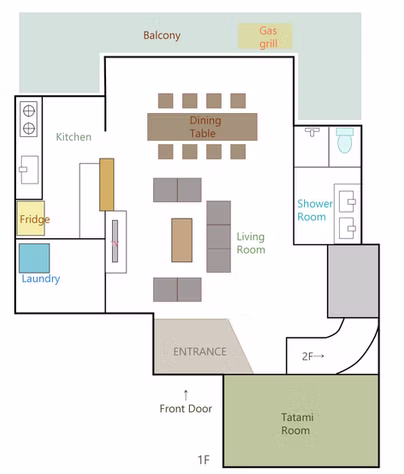 Best choice for family & group trips. The whole house allows up to 15 guests – spacious bedrooms, tatami room, 2 bathrooms, large living room, full kitchen, terrace with BBQ and free parking.